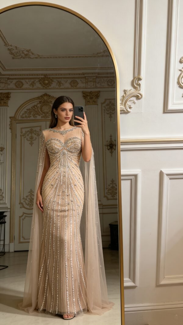 JC2615 Beige beaded evening gown long sleeve water sleeve prom dress ,Hand-sewn sequin bridesmaid gown elegant formal gown